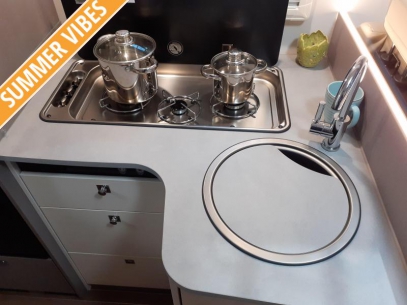 Door de ruime en comfortabele L-zit nodigt de camper uit voor gezellige avonden. Centraal in de camper bevindt zich de complete middenkeuken. Voor een snelle toevoer van warm water is er een 10 liter boiler aanwezig.